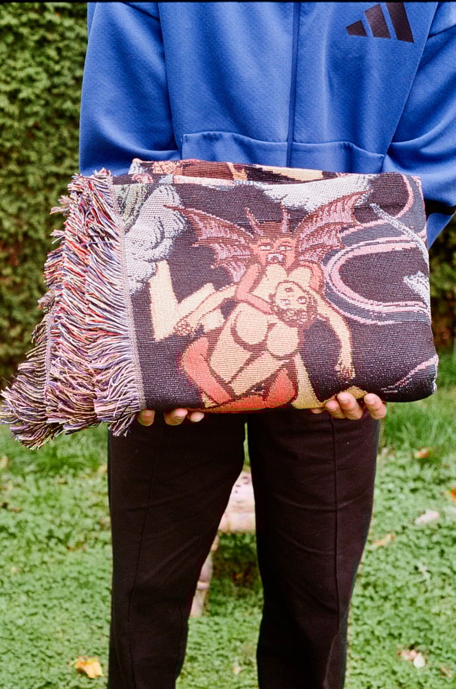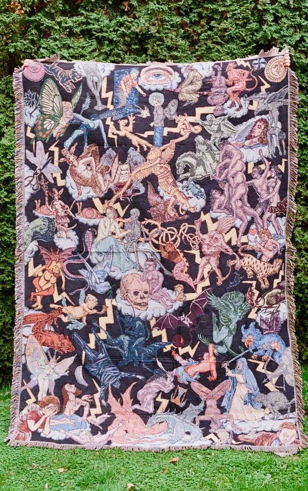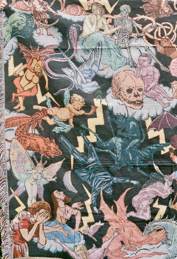 Woven / Cotton and polyester blend / Blanket or tapestry / 62x82 inches.